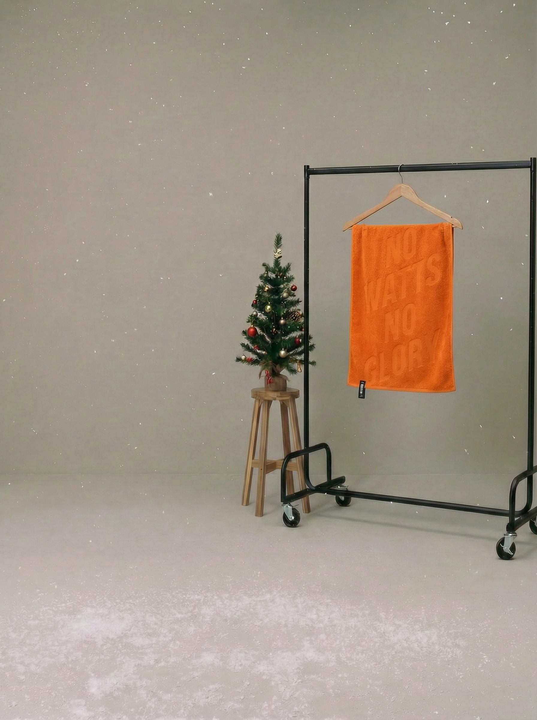The La Machine Cycle Club No Watts No Glory Towel (60x80 cm) is orange, made of 100% cotton, and features the slogan printed diagonally. A black tag accents the upper left edge. The background is plain white.No Watts No Glory - Towel - 60x80 cm