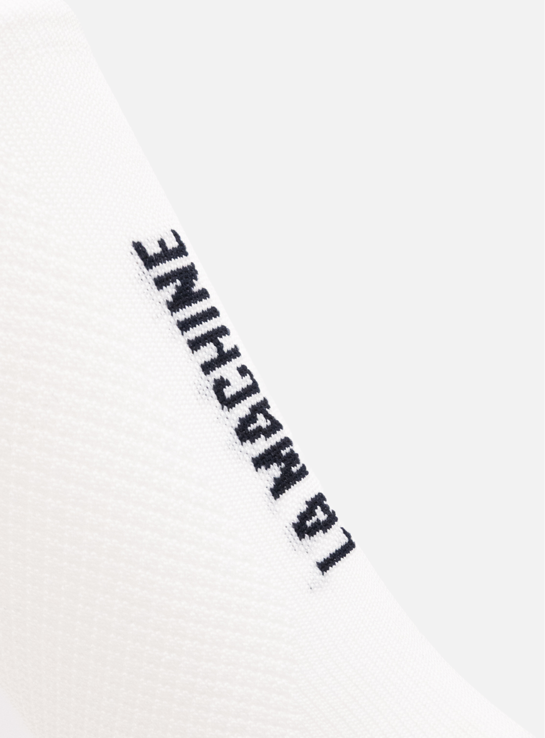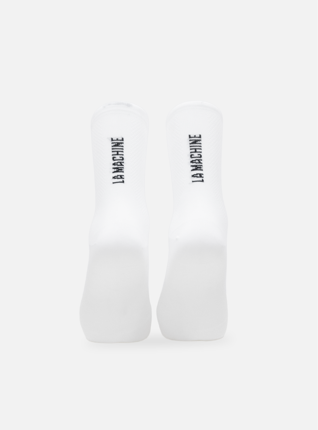 NewA pair of La Machine Logo - Cycling Socks in white by La Machine Cycle Club shown vertically on a plain light grey background, with bold black LA MACHINE branding on the soles.Close-up of La Machine Logo - Cycling Socks in white by La Machine Cycle Club, featuring LA MACHINE text in black capitals running vertically. Unisex design suits any style.