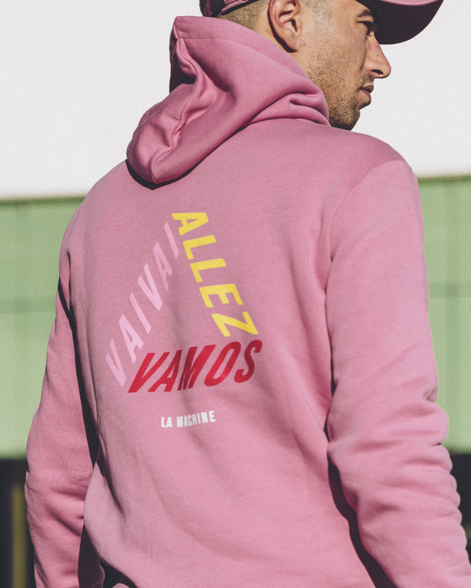 The Vai Allez Vamos Hoodie by La Machine Cycle Club is a pink cycling sweatshirt with “VAIVA!, ALLEZ!, VAMOS!” in bold triangle formation on the back, Tour de France-inspired, and “LA MACHINE” in small white text below.