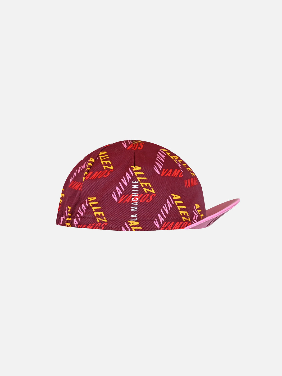 The Vai Allez Vamos Cycling Cap by La Machine Cycle Club features pink and maroon colors, VAMOS and ALIVE! in red and yellow on top, and VAMACHINE in bold black under the brim, inspired by the Vuelta a España.