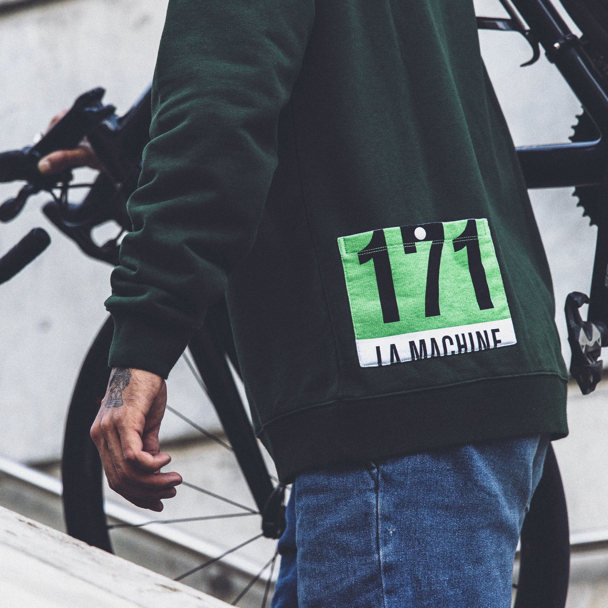 The Maillot Vert Sweatshirt by La Machine Cycle Club is a forest green men’s sweatshirt made in the EU from 100% cotton, featuring a neon green patch near the hem with “171” and LA MACHINE branding.