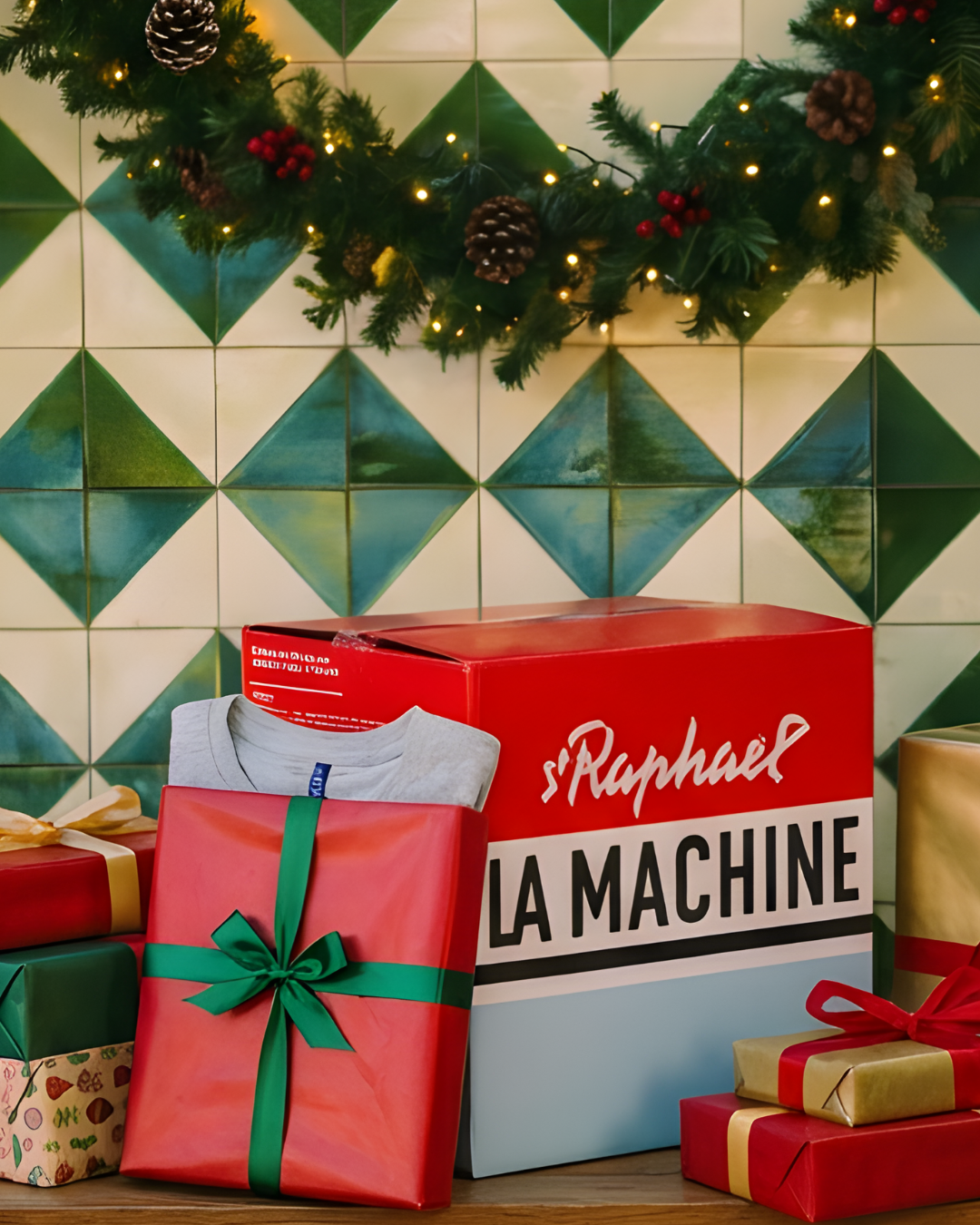 La Machine Nekwarmer - Vuelta RoodA red rectangular paper bag with a diamond pattern and La Machine Cycle Club in white—an elegant way to present your new Grand Tours Bundle unisex neck warmers.