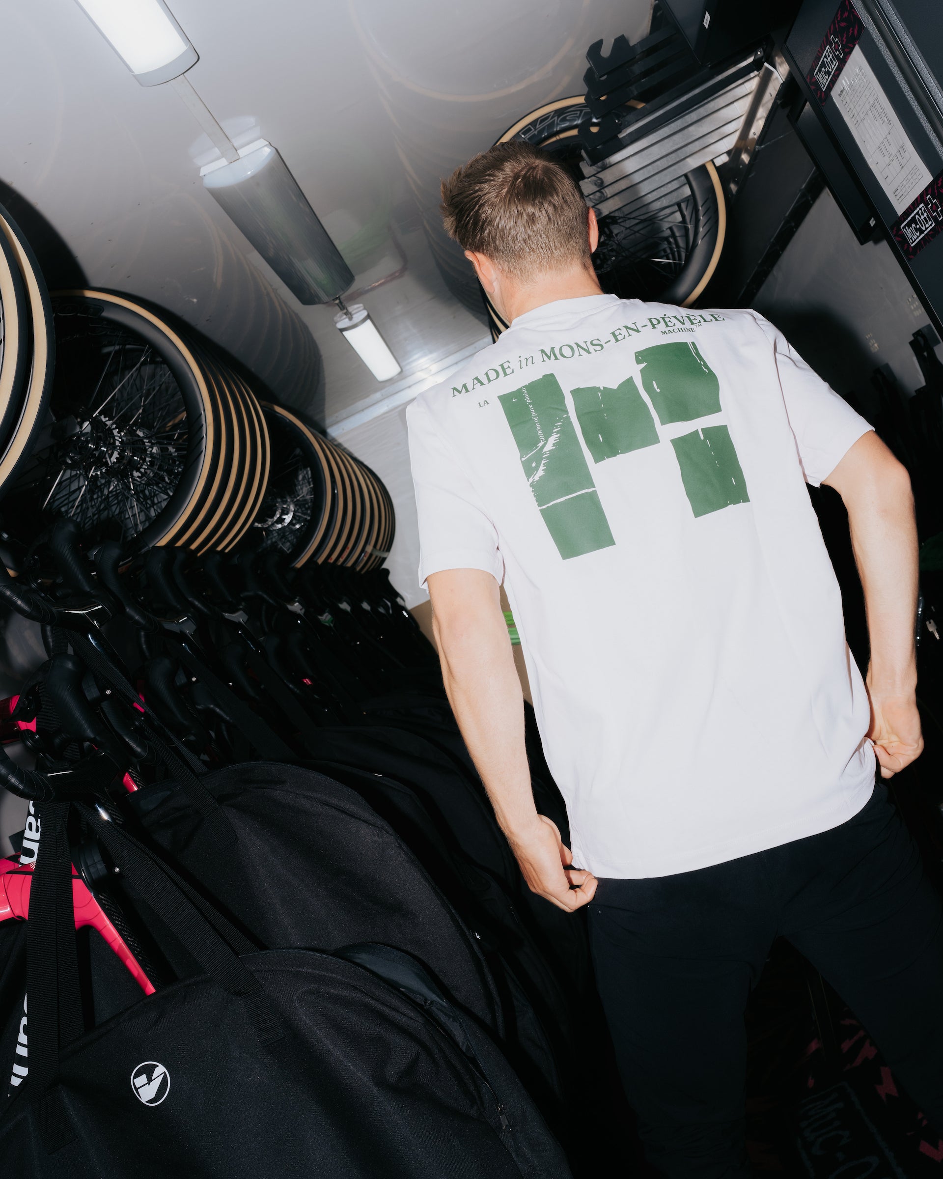 La Machine Cycle Club Made in Mons-en-Pévèle Loose Fit T-shirt features green abstract block graphics and MADE in MONS-EN-PÉVÈLE text on the back, inspired by iconic Paris-Roubaix cycling apparel, plus small LA and MADE IN details.